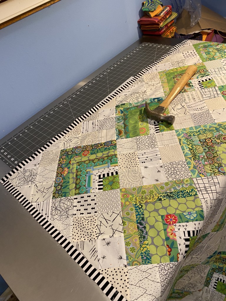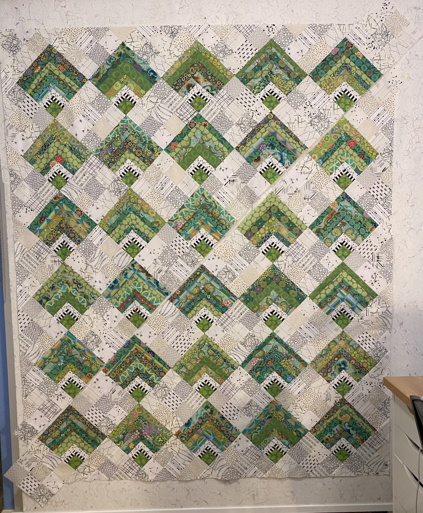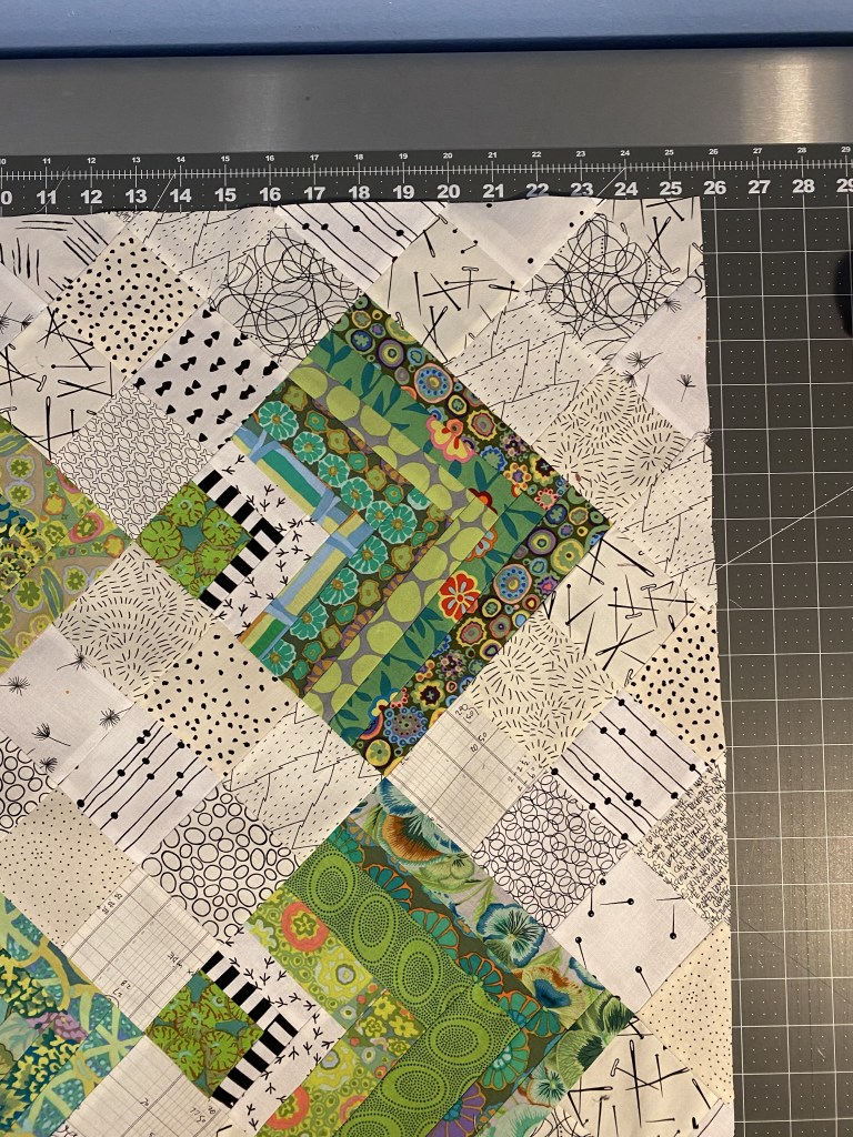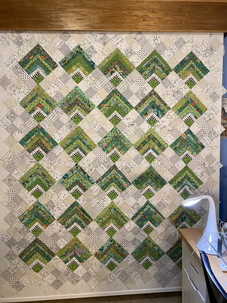 Before I had to go and pick up my dinner I decided to press my green quilt again. I was concerned that the edges were a little wavy when it was on the design wall and I was afraid I had stretched out all those bias edges. So I pressed it using some fabric stabilizer.