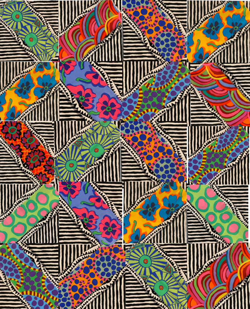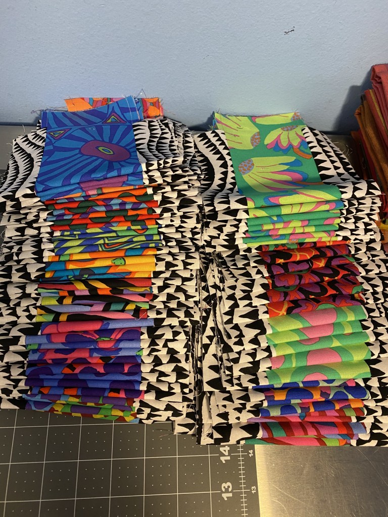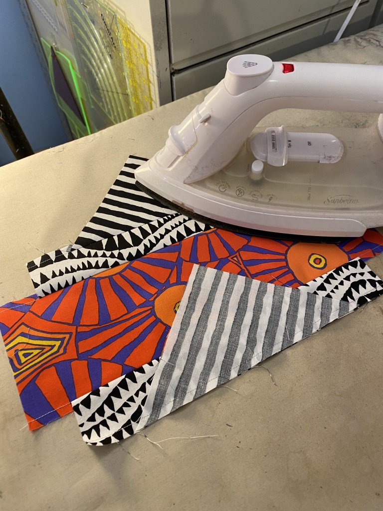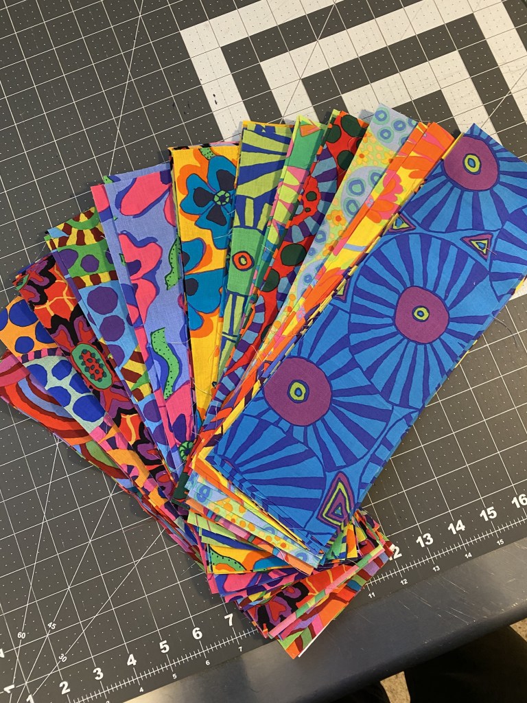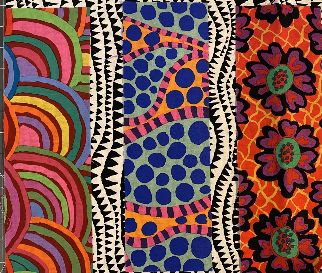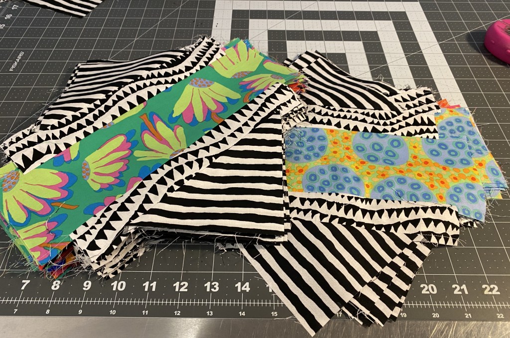 I decided to dig in and make some Frankenbag panels out of the strips I cut off my Aboriginal Libby quilt yesterday. I knew that if I didn’t get it done right away those scarps would sit in a drawer for years.