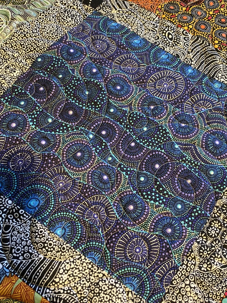I slept in a little this morning after being up early the last three days. It felt good to sleep until after 9 am. After breakfast and some strong coffee I was off to my long arm quilter to pick up my friend’s Australian Aboriginal quilt and deliver my Aboriginal Libby quilt for her to quilt.