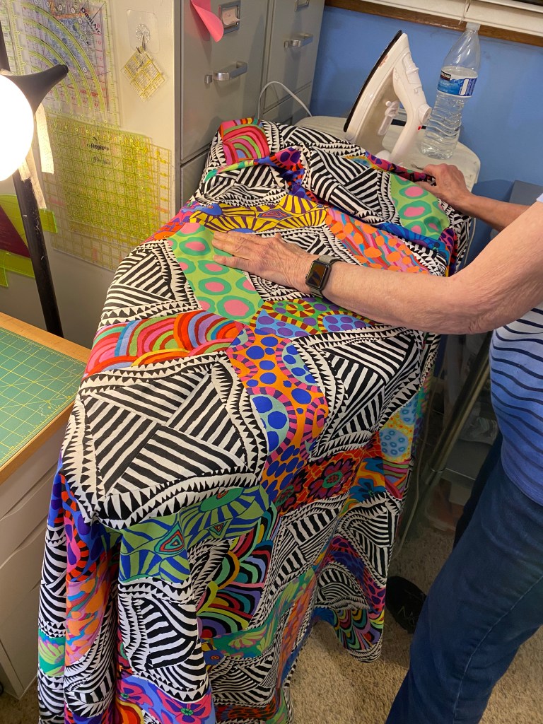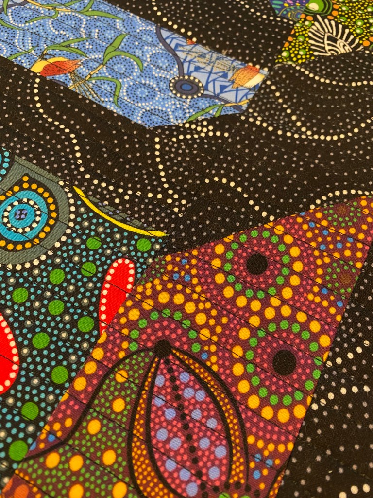 I really wish I could get a good photo of those batiks. They are so dark in this photo. In reality they are softer and much more vibrant. I’m enjoying sewing with them. It’s been some time since I made a quilt from batiks.