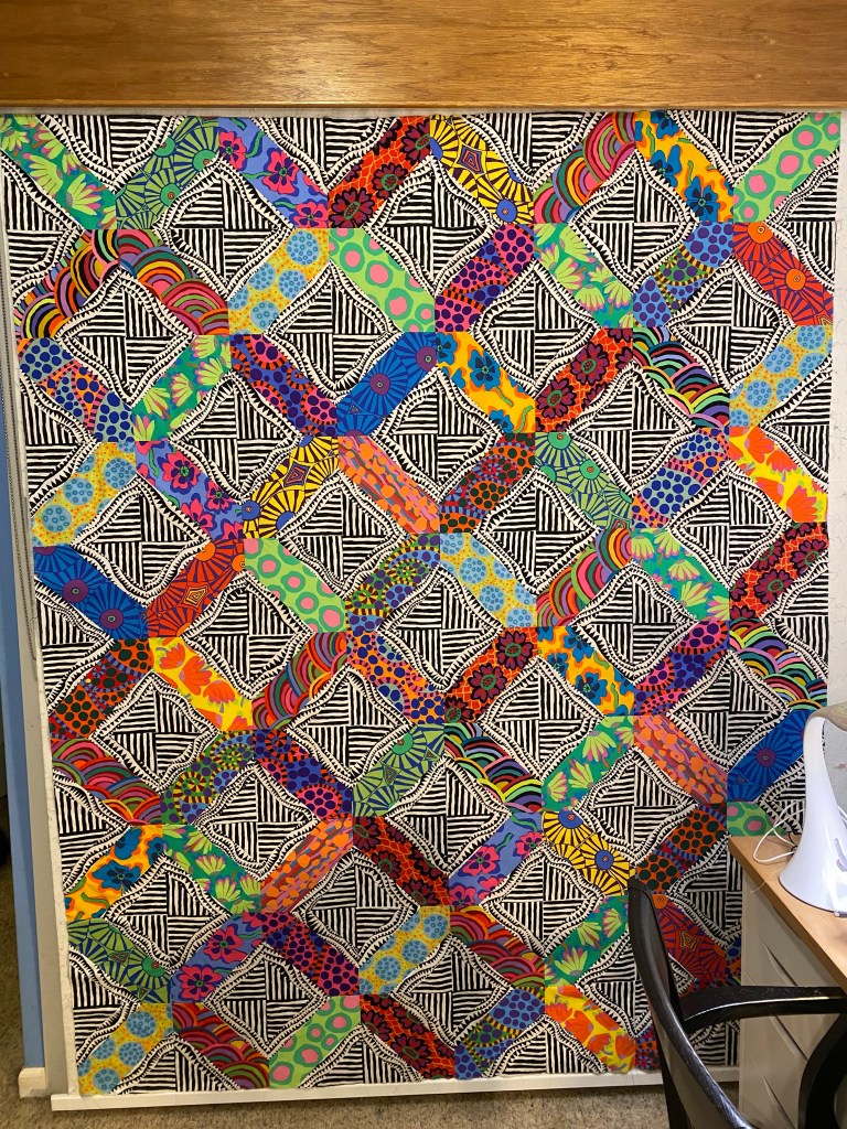 This next picture shows how the blocks will be spaced out when this is done. Where the white of my design wall shows through will be more batik strips. So the plaid design will be accentuated with those lines.