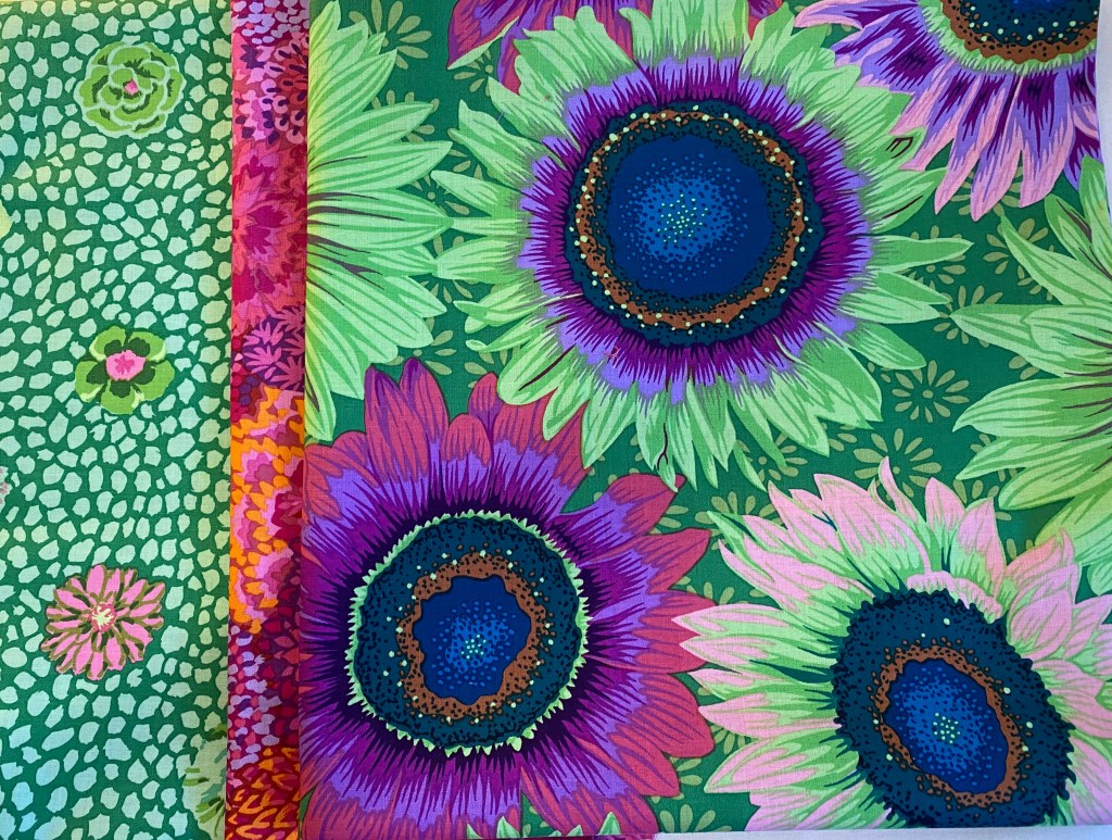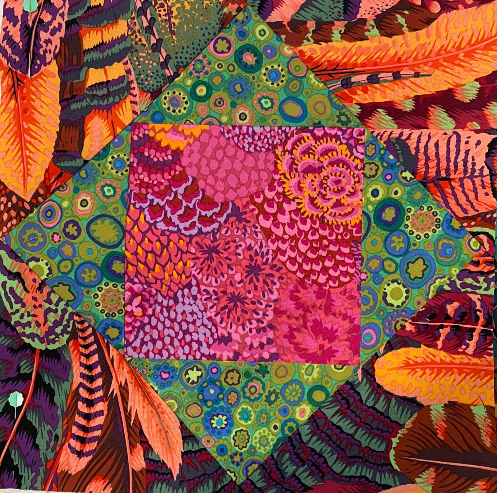 I had wanted to make this using Philip Jacob’s Van Gogh in the green color way but wasn’t sure what to use with it. And the green guinea flower is perfect for the background fabric. I ordered some purple Ferns, thinking it would work for the accent strips, but it sort of left me flat. It just feels a little blah.