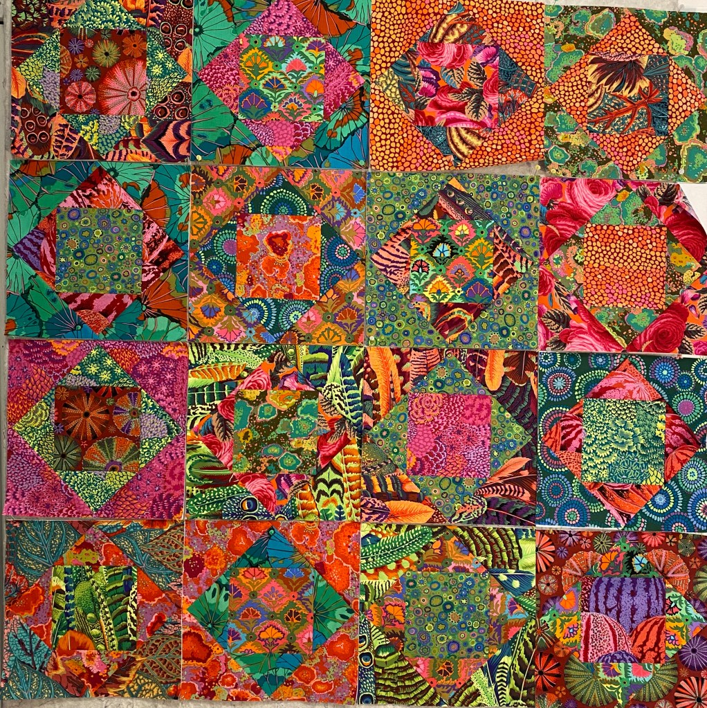 I’ve had this pattern for at least a year and had an idea of the fabrics I wanted to use for it. I’ve seen some gorgeous versions made from Kaffe Fassett Collective fabrics. And when the new green color way of Kaffe’s Guinea Flower came out in the new collection, I decided to get the fabric I need for this.