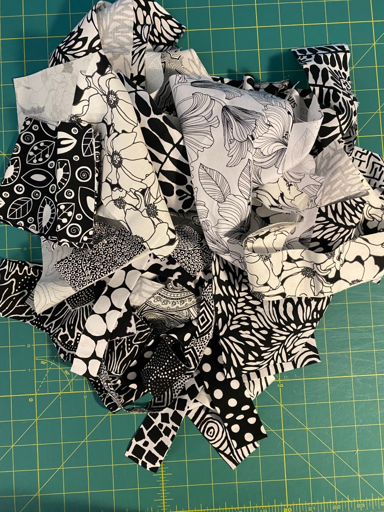 The new project I’ve been working on is made from leftovers of my black/white/pink Interweave quilt. I decided to use those black and white fabrics, add a few from my stash, and play around a little. Initially I thought I would make another Algorithm quilt so started off in that direction.
