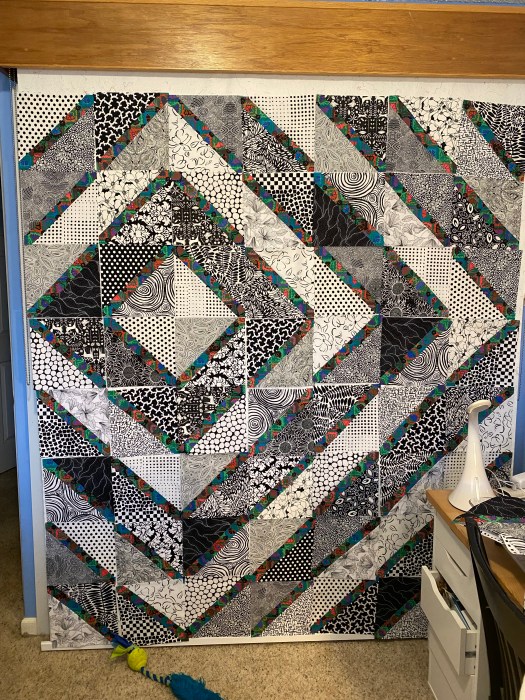 So I cut the black and whites into 10 inch squares, cut them in half and added in the colored strips. As I made blocks I threw them up on the design wall and liked what I saw and started thinking…