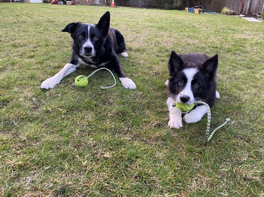 Here they are running out at the sheep coop on. Saturday. This is the first time they’ve run together like this. It’s a very common border collie activity and so much fun to see! Poor Rico finally gave in… against his will and better judgment.
