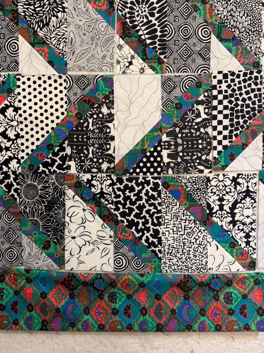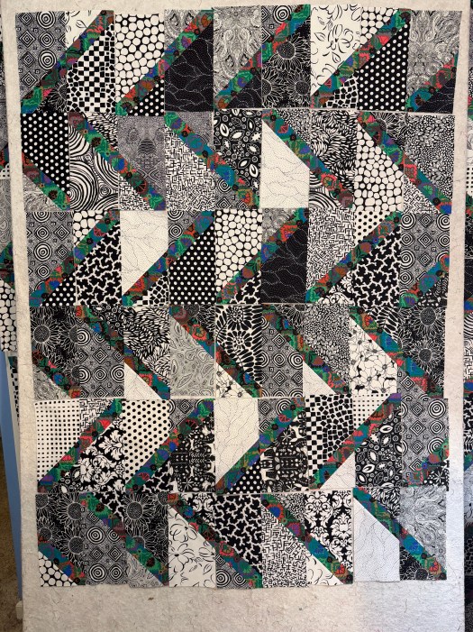 Once I got all my diagonal black and white blocks up on the design wall I realized that I had quite a few blocks left over. So I decided to continue with my original plan with these blocks. So I finished them up to make an Algorithm quilt. Just the blocks would make a small quilt, so I ordered 1.5 yards of the strip fabric so I can add a substantial border to bring this up to a good size. I didn’t want to make more blocks.