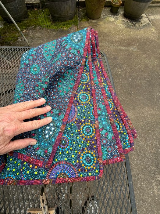 I just love all those gorgeous jewel tone fabrics! And the Aboriginal fabrics sparkle! My former co-worker that I gifted the bag to said the fabric reminded her of the night sky.