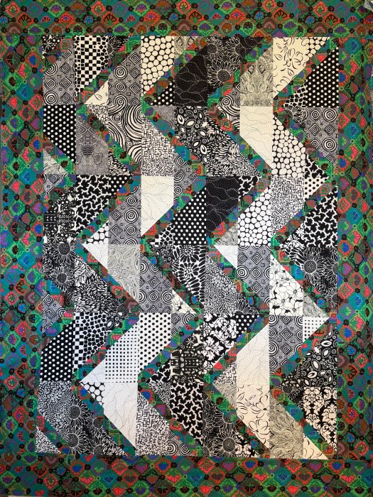 I left the second black and white leftover quilt blocks on my design wall for a few days and decided that I wasn’t loving what I had done because it felt chaotic and didn’t make any sense. I played with a different layout of alternating black and white zig zags and I like it so much better. So I sewed it all together and added the borders.