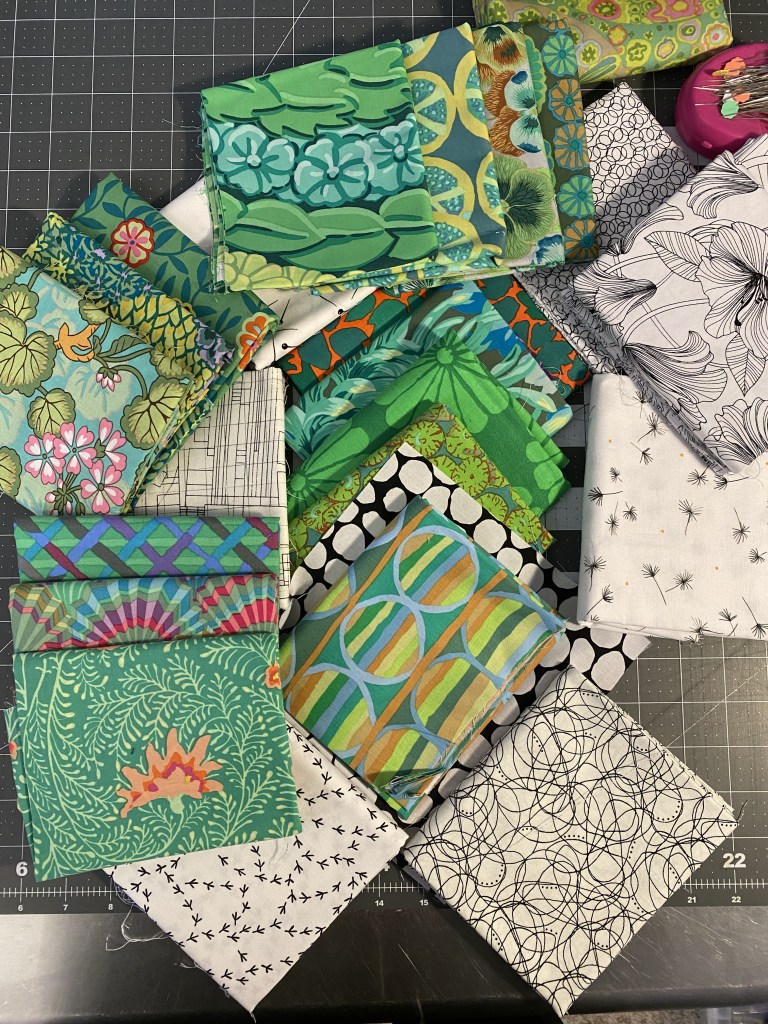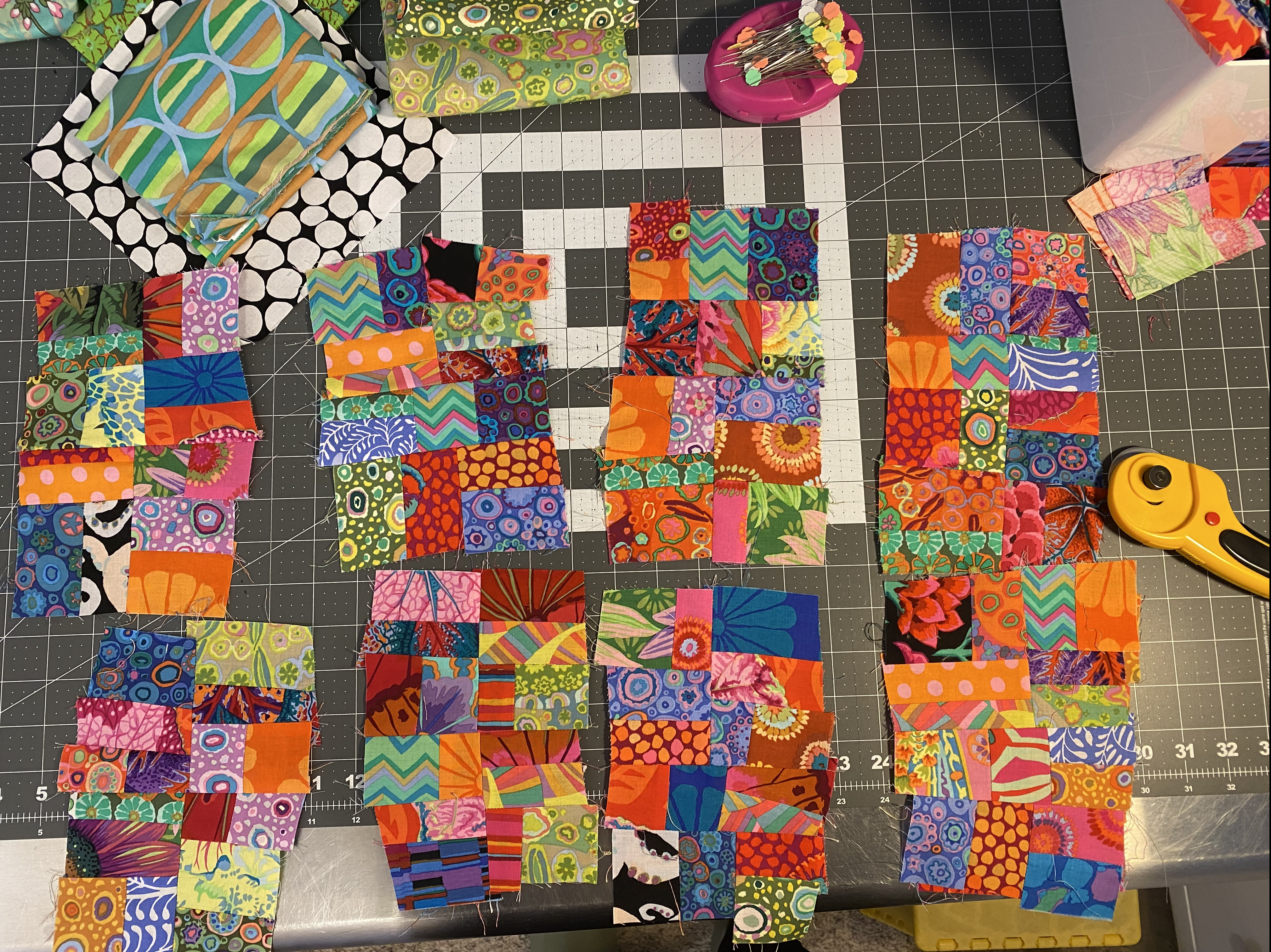 The remaining sashing pieces we need for this quilt are sitting on the cutting table. We won’t add those to blocks on the bottom and right side until we decide this design is final.