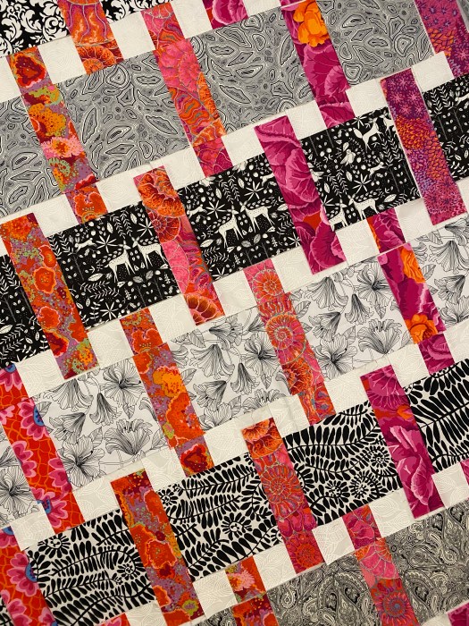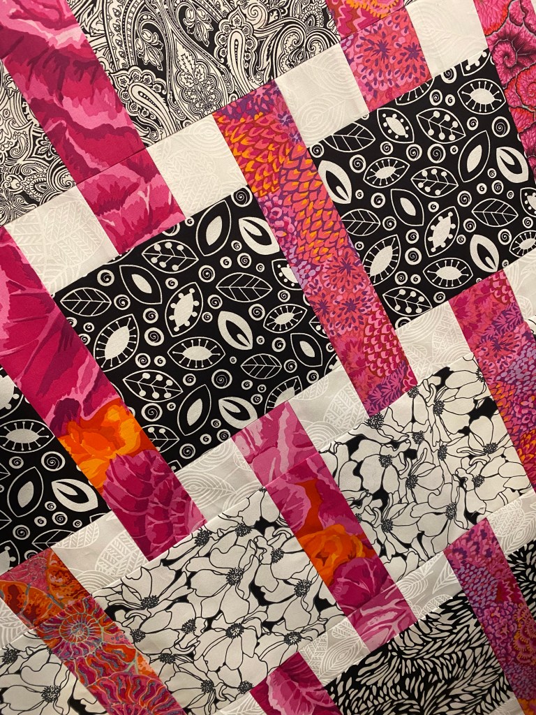 I decided to take some time on Saturday and finish up the black, white and pink Interweave quilt I had been working on. It only took a couple of hours, and it’s done!